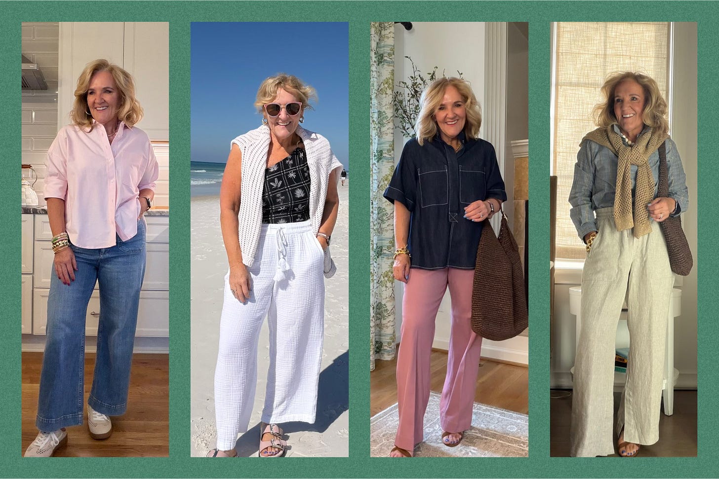 Right: Linen pants, chambray blouse & metallic sweater